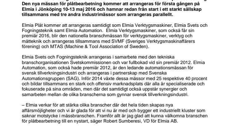 – Elmia verkar för att stärka olika branscher där det hela tiden skapas nya affärsmöjligheter och vi är glada för att vi nu är med och bygger ett industriellt kluster som saknar motstycke i mässbranschen. Framför allt är jag glad att kunna välkomna branschen för plåtbearbetning till en nystart, säger Robert Sumberesi, VD för Elmia AB.