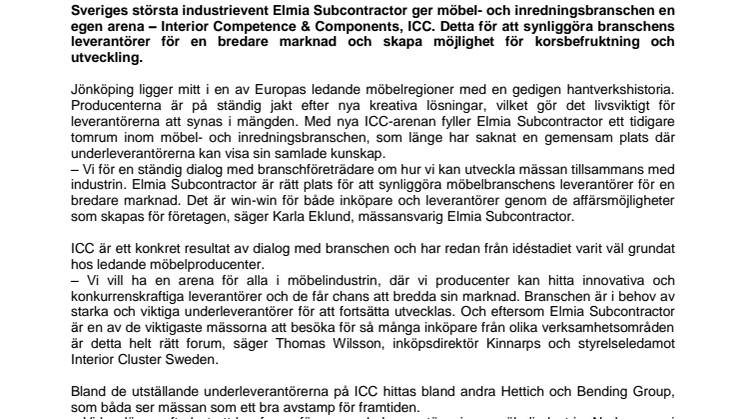 Sveriges största industrievent Elmia Subcontractor ger möbel- och inredningsbranschen en egen arena – Interior Competence & Components, ICC. Detta för att synliggöra branschens leverantörer för en bredare marknad och skapa möjlighet för korsbefruktning och utveckling.