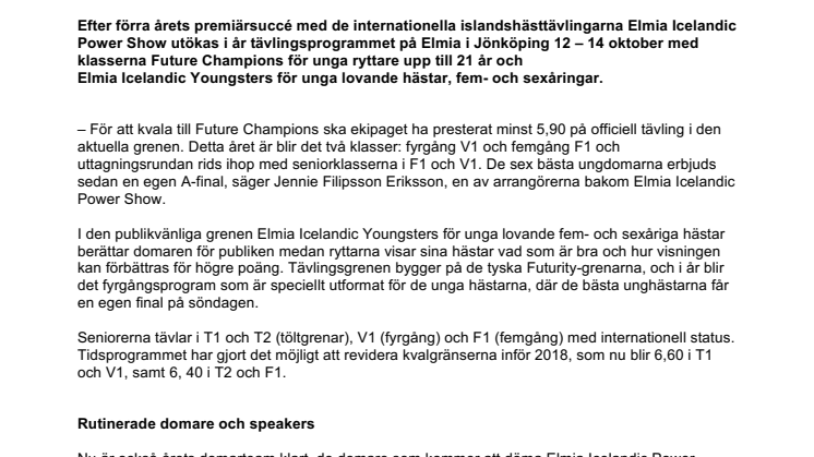 Efter förra årets premiärsuccé med de internationella islandshästtävlingarna Elmia Icelandic Power Show utökas i år tävlingsprogrammet på Elmia i Jönköping 12 – 14 oktober med klasserna Future Champions för unga ryttare upp till 21 år och Elmia Icelandic Youngsters för unga lovande hästar, fem- och sexåringar.