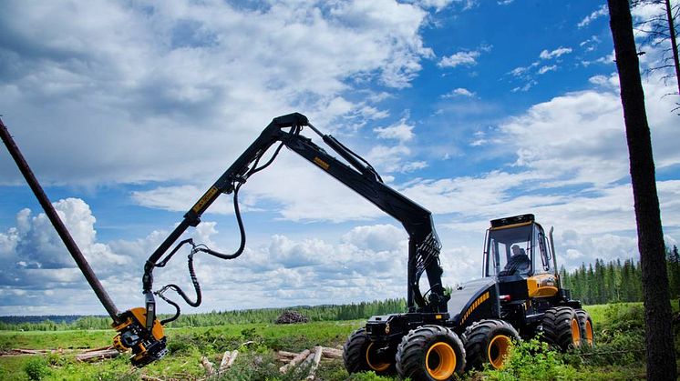 Bildtext: Den nya gallringsskördaren Fox har i likhet med Ponsses övriga skördare utrustats med en uppdaterad kran för lägre bränsleförbrukning. Foto: Ponsse