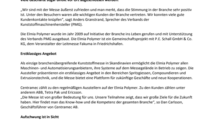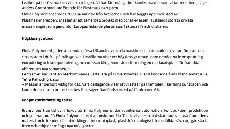 Centramec har varit en återkommande utställare på Elmia Polymer. Bland kunderna finns bland annat ABB, Tetra Pak och Ericsson.