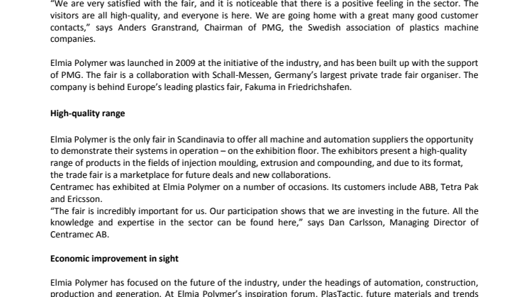 – Vi är mycket nöjda med mässan och det märks att det råder en positiv känsla i branschen. Det är hög kvalitet på besökarna och vi saknar ingen. Vi har fått många bra kundkontakter som vi tar med hem, säger Anders Granstrand, ordförande för Plastmaskingruppen.