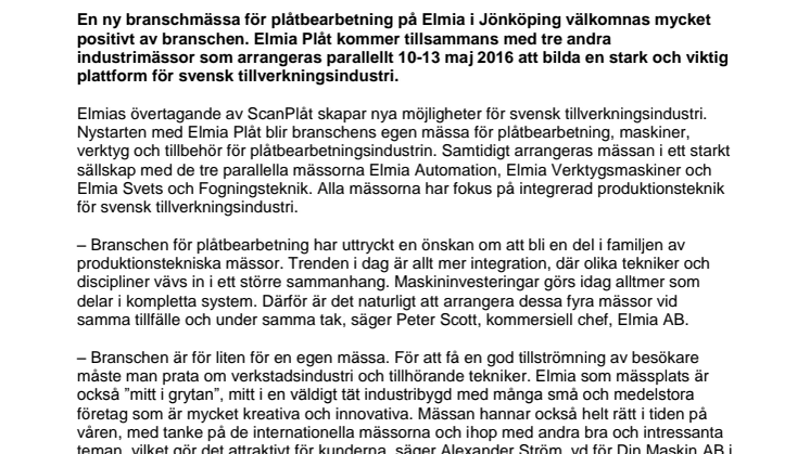 Elmias övertagande av ScanPlåt skapar nya möjligheter för svensk tillverkningsindustri. Nystarten med Elmia Plåt blir branschens egen mässa för plåtbearbetning, maskiner, verktyg och tillbehör för plåtbearbetningsindustrin. Samtidigt arrangeras mässan i ett starkt sällskap med de tre parallella mässorna Elmia Automation, Elmia Verktygsmaskiner och Elmia Svets och Fogningsteknik. Alla mässorna har fokus på integrerad produktionsteknik för svensk tillverkningsindustri.