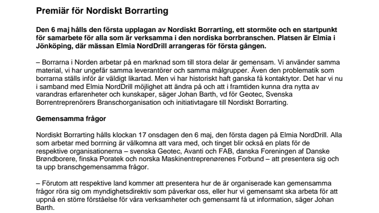 Nordiskt Borrarting hålls klockan 17 onsdagen den 6 maj, den första dagen på Elmia NordDrill. Alla som arbetar med borrning är välkomna att vara med, och tinget blir också en plats för de respektive organisationerna – svenska Geotec, Avanti och FAB, danska Foreningen af Danske Brøndborere, finska Poratek och norska Maskinentreprenørenes Forbund – att presentera sig och ta upp branschgemensamma frågor.