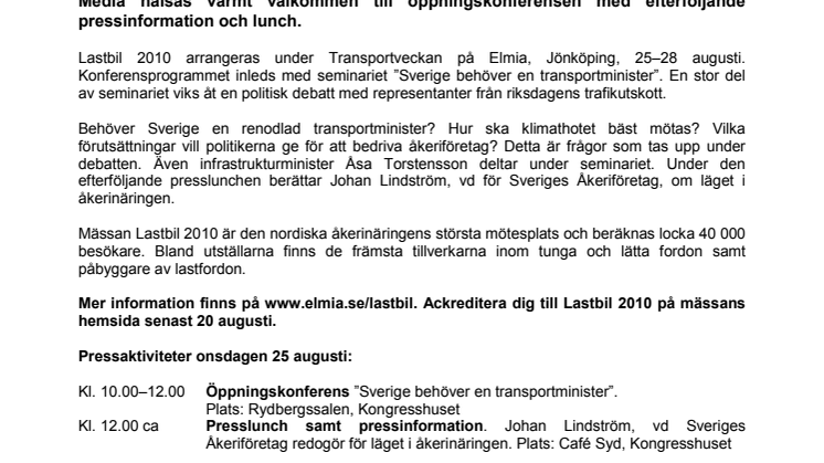 Lastbil 2010 arrangeras under Transportveckan på Elmia, Jönköping, 25–28 augusti. Konferensprogrammet inleds med seminariet ”Sverige behöver en transportminister”. En stor del av seminariet viks åt en politisk debatt med representanter från riksdagens trafikutskott.