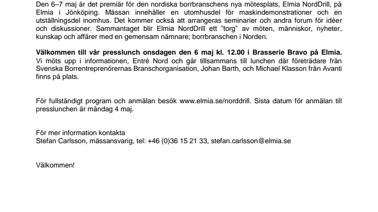 För fullständigt program och anmälan besök www.elmia.se/norddrill. Sista datum för anmälan till presslunchen är måndag 4 maj.