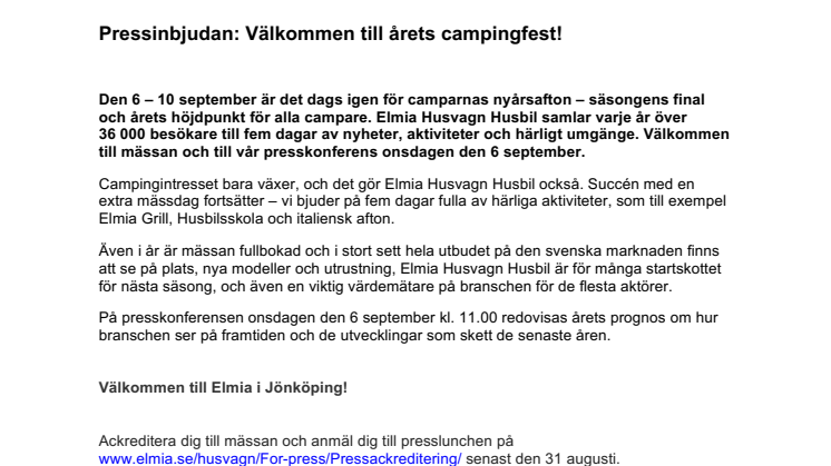 Den 6 – 10 september är det dags igen för camparnas nyårsafton – säsongens final och årets höjdpunkt för alla campare. Elmia Husvagn Husbil samlar varje år över 36 000 besökare till fem dagar av nyheter, aktiviteter och härligt umgänge. Välkommen till mässan och till vår presskonferens onsdagen den 6 september.