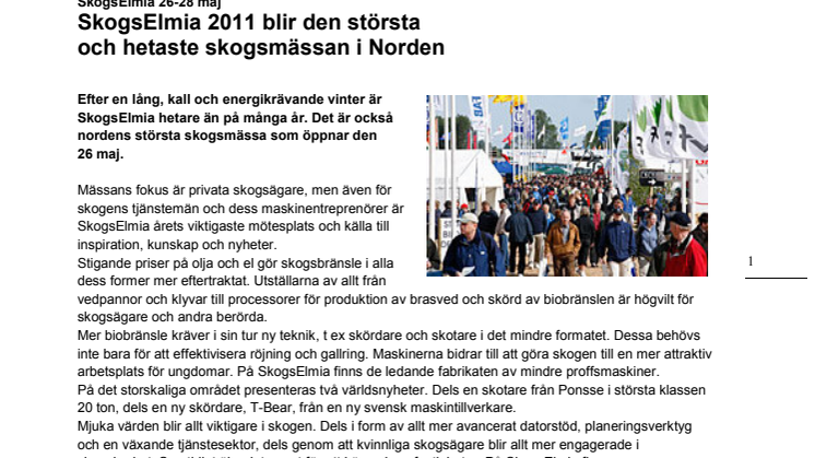 Efter en lång, kall och energikrävande vinter är SkogsElmia hetare än på många år. Det är också nordens största skogsmässa som öppnar den 26 maj. Mässans fokus är privata skogsägare, men även för skogens tjänstemän och dess maskinentreprenörer är SkogsElmia årets viktigaste mötesplats och källa till inspiration, kunskap och nyheter.