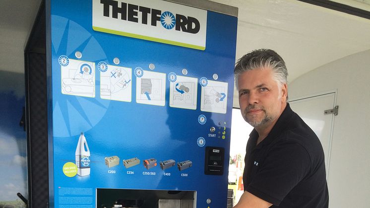 Demonstrationsexemplaret på Elmia Husvagn Husbil är Thetfords tolfte tillverkade maskin. Sedan förra året finns elva maskiner utplacerade på campingplatser runt om i Nederländerna. Thetford äger och servar själva sina maskiner, och av de runt 3 Euro som en tömningstvätt kostar får campingägaren också en liten peng.