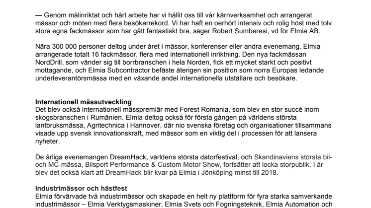 — Genom målinriktat och hårt arbete har vi hållit oss till vår kärnverksamhet och arrangerat mässor och möten med flera besökarrekord. Vi har haft en oerhört intensiv och rolig höst med tolv stora egna fackmässor som har gått fantastiskt bra, säger Robert Sumberesi, vd för Elmia AB.