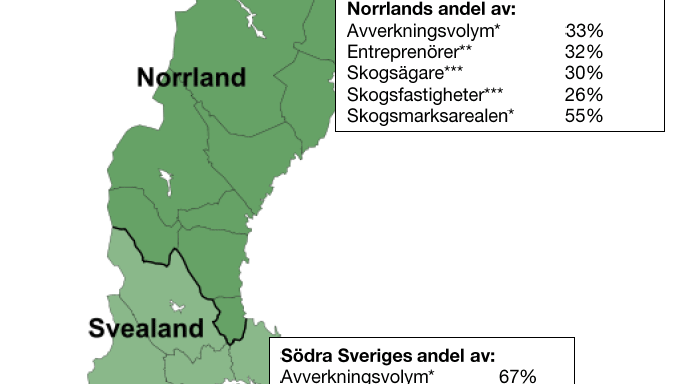 Två tredjedelar eller mer av såväl avverkningsvolymer, antal skogsägare som skogsmaskinentreprenörer kan relateras till Svealand och Götaland, trots att mer än hälften av skogsmarksarealen ligger i Norrland. Skälet till den ojämna fördelningen är främst att tillväxt och virkesförråd blir lägre ju längre norrut man kommer.
