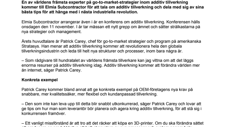 Årets huvudtalare är Patrick Carey, chef för go-to-market strategier och program på amerikanska Stratasys. Han menar att additiv tillverkning kommer att revolutionera hela den globala tillverkningsindustrin och leda till helt nya strukturer och processer, inom bara några år.