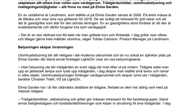 En av utställarna är Landmann, som ställde ut på Elmia Garden senast år 2006. På årets mässa är de tillbaka och visar sina nya grillserier för 2018. De ser tydligt att intresset för grill växer och att det är gasolgrillar som står för den största ökningen. En av gasolgrillens stora fördelar är att den är snabbstartande och därför fungerar bra som vardagsgrill.