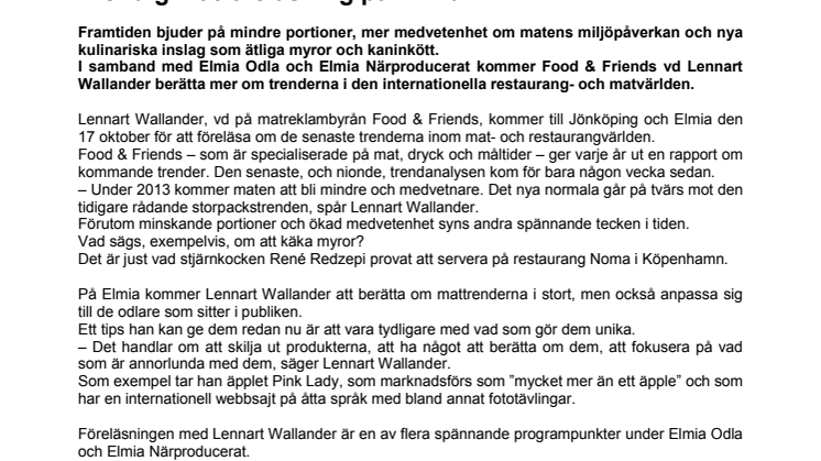 Lennart Wallander, vd på matreklambyrån Food & Friends, kommer till Jönköping och Elmia den 17 oktober för att föreläsa om de senaste trenderna inom mat- och restaurangvärlden.