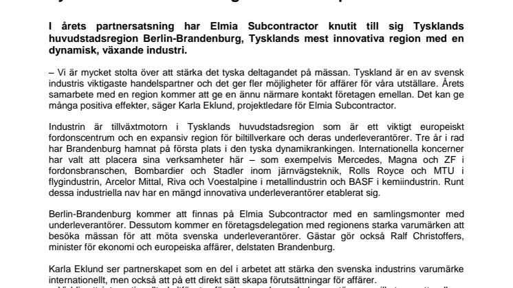 I årets partnersatsning har Elmia Subcontractor knutit till sig Tysklands huvudstadsregion Berlin-Brandenburg, Tysklands mest innovativa region med en dynamisk, växande industri.