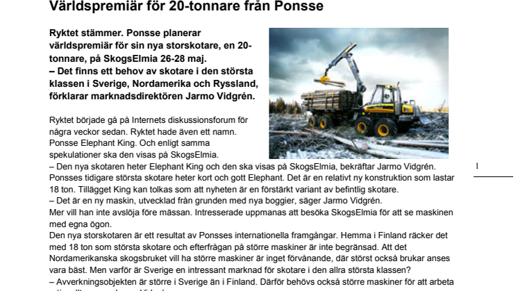 Ryktet började gå på Internets diskussionsforum för några veckor sedan. Ryktet hade även ett namn. Ponsse Elephant King. Och enligt samma spekulationer ska den visas på SkogsElmia.