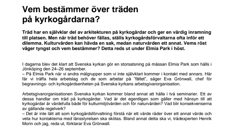 Träd har en självklar del av arkitekturen på kyrkogårdar och ger en värdig inramning till platsen. Men när träd behöver fällas, ställs kyrkogårdsförvaltarna ofta inför ett dilemma. Kulturvården kan hävda en sak, medan naturvården ett annat. Vems röst väger tyngst och vem bestämmer? Detta reds ut under Elmia Park i höst.
