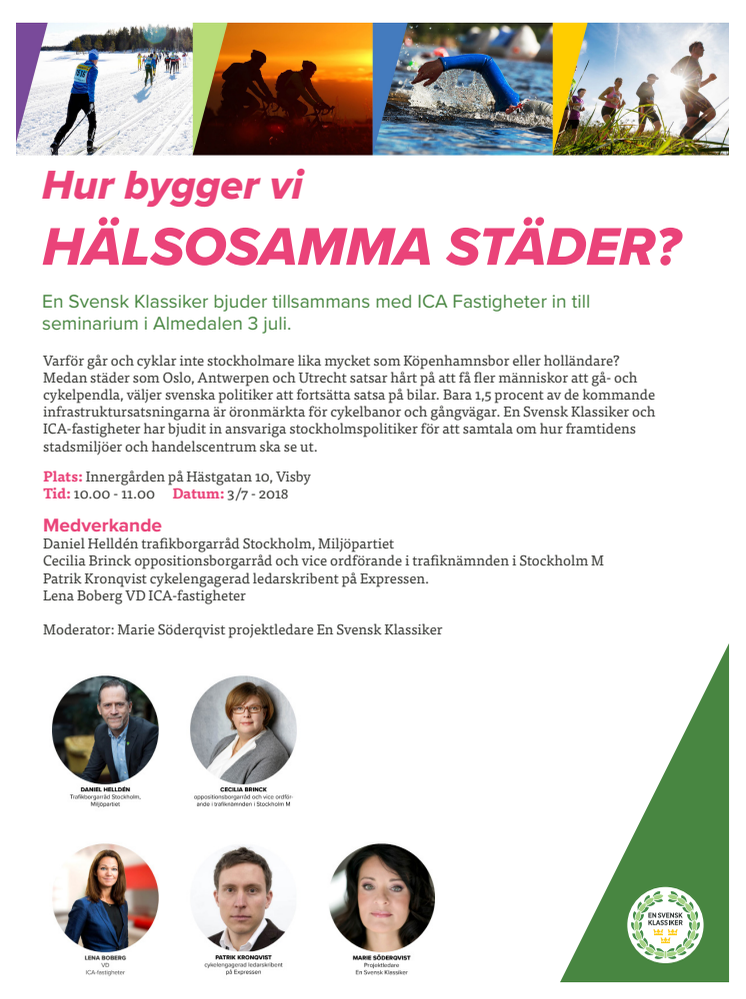 En Svensk Klassiker bjuder tillsammans med ICA Fastigheter in till seminarium i Almedalen 3:e juli för att samtala om hur framtidens stadsmiljöer och handelscentrum ska se ut. Medverkande är Daniel Helldén trafikborgarråd Stockholm, Cecilia Brinck oppositionsborgarråd och vice ordförande i trafiknämnden i Stockholm, Patrik Kronqvist ledarskribent Expressen samt Lena Boberg VD ICA-fastigheter.