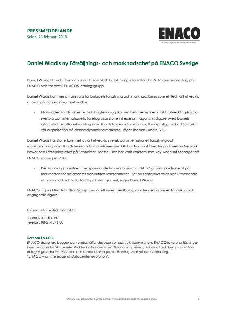 Daniel Wladis tillträder från och med 1 mars 2018 befattningen som Head of Sales and Marketing på ENACO och tar plats i ENACOS ledningsgrupp. Daniel Wladis kommer att ansvara för bolagets försäljning och marknadsföring som ett led i att utveckla affären på den svenska marknaden.