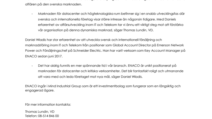 Daniel Wladis tillträder från och med 1 mars 2018 befattningen som Head of Sales and Marketing på ENACO och tar plats i ENACOS ledningsgrupp. Daniel Wladis kommer att ansvara för bolagets försäljning och marknadsföring som ett led i att utveckla affären på den svenska marknaden.