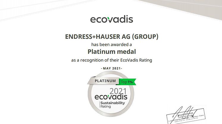 Endress+Hauser har förbättrats ytterligare inom kategorierna för miljö och hållbarhet. Vad gäller företagsetik, arbetsvillkor och mänskliga rättigheter behåller koncernen en mycket bra placering. Det innebär att Endress+Hauser med sina resultat ligger i toppen och får en platinamedalj efter standarden Gold – den högsta nivån i EcoVadis revisionen.