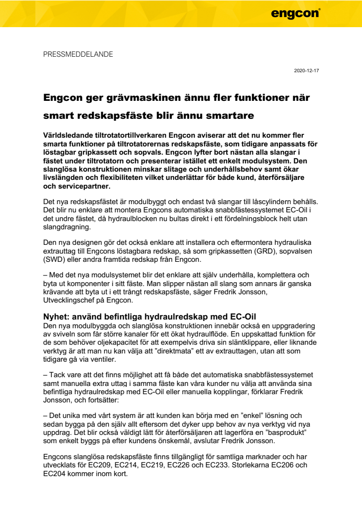 Världsledande tiltrotatortillverkaren Engcon aviserar att det nu kommer fler smarta funktioner på tiltrotatorernas redskapsfäste, som tidigare anpassats för löstagbar gripkassett och sopvals. Engcon lyfter bort nästan alla slangar i fästet under tiltrotatorn och presenterar istället ett enkelt modulsystem.