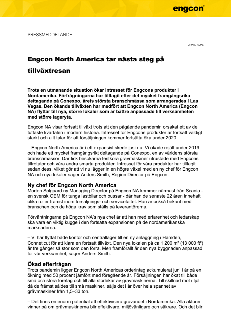 Trots en utmanande situation ökar intresset för Engcons produkter i Nordamerika. Förfrågningarna har tilltagit efter det mycket framgångsrika deltagande på Conexpo, årets största branschmässa som arrangerades i Las Vegas. Den ökande tillväxten har medfört att Engcon North America (Engcon NA) flyttar till nya, större lokaler som är bättre anpassade till verksamheten med större lageryta.