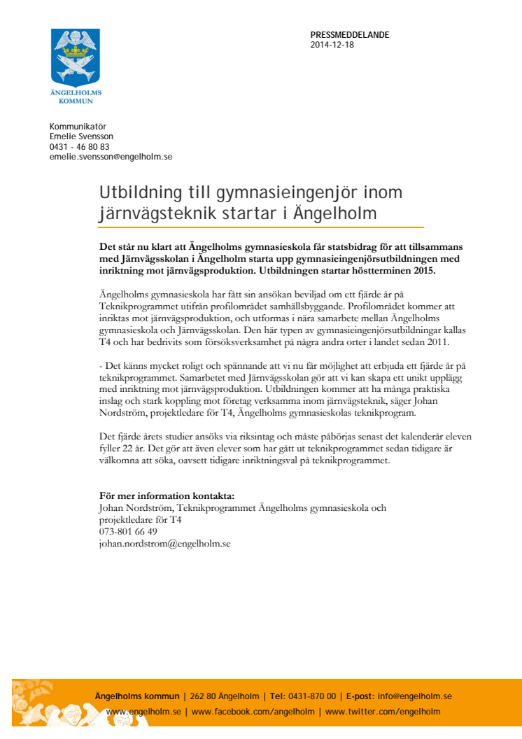 Det står nu klart att Ängelholms gymnasieskola får statsbidrag för att tillsammans med Järnvägsskolan i Ängelholm starta upp gymnasieingenjörsutbildningen med inriktning mot järnvägsproduktion. Utbildningen startar höstterminen 2015.
