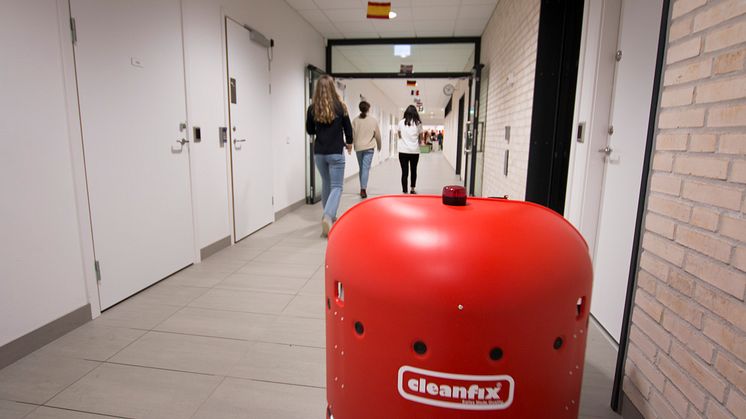 Ett dovt motorljud ljuder genom den nybyggda Nyhemsskolan i Ängelholm. Brummandet kommer från skolans nytillskott – en städrobot.