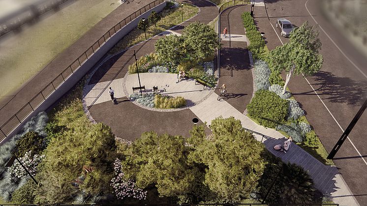 Området kommer att prydas med planteringar och träd för att skapa en grön och trevlig miljö. Platser med bänkar kommer att byggas för att skapa trevliga mötesplatser.