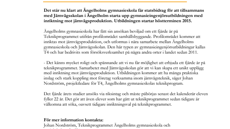 Det står nu klart att Ängelholms gymnasieskola får statsbidrag för att tillsammans med Järnvägsskolan i Ängelholm starta upp gymnasieingenjörsutbildningen med inriktning mot järnvägsproduktion. Utbildningen startar höstterminen 2015.