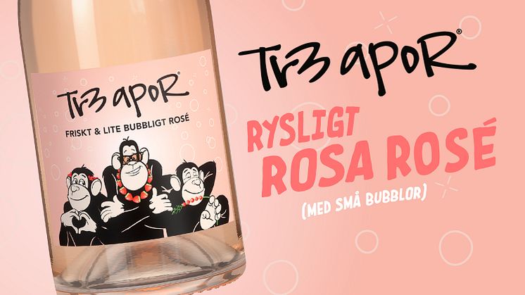 Ännu en nyhet från aporna! Vårt nya rosé smakar smultron, en hint av röda vinbär och massor med solmogna jordgubbar. Det är bärigt, friskt och fräscht och bubblar sådär lagom mycket. Tr3 Apor Lite Bubbligt Rosé är ett perfekt rosa rosé som går att beställa på Systembolaget.se för 69 kr från den 6 maj.