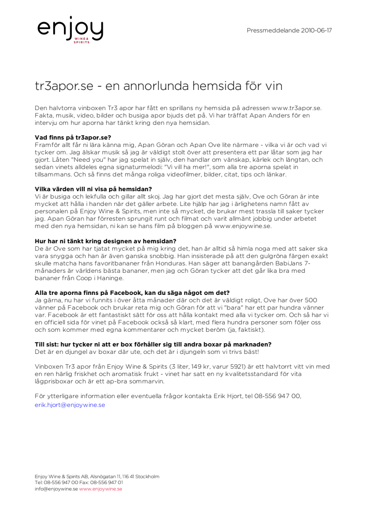 För ytterligare information eller eventuella frågor kontakta Erik Hjort, tel 08-556 947 00, erik.hjort@enjoywine.se