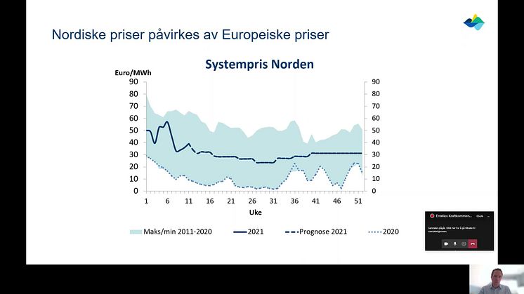 Kraftpriset i södra Norge håller sig relativt nära de tyska priserna som förutom under dagar med väldigt hög vindkraftsproduktion generellt är högre än de nordiska priserna i genomsnitt.