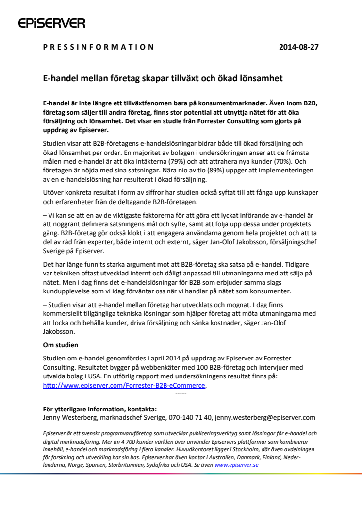 E-handel är inte längre ett tillväxtfenomen bara på konsumentmarknader. Även inom B2B, företag som säljer till andra företag, finns stor potential att utnyttja nätet för att öka försäljning och lönsamhet. Det visar en studie från Forrester Consulting som gjorts på uppdrag av Episerver.