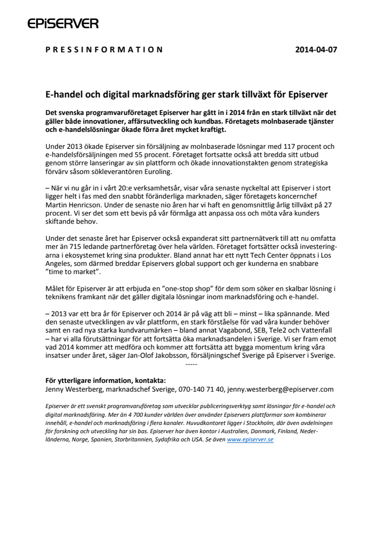 Det svenska programvaruföretaget Episerver har gått in i 2014 från en stark tillväxt när det gäller både innovationer, affärsutveckling och kundbas. Företagets molnbaserade tjänster och e-handelslösningar ökade förra året mycket kraftigt.