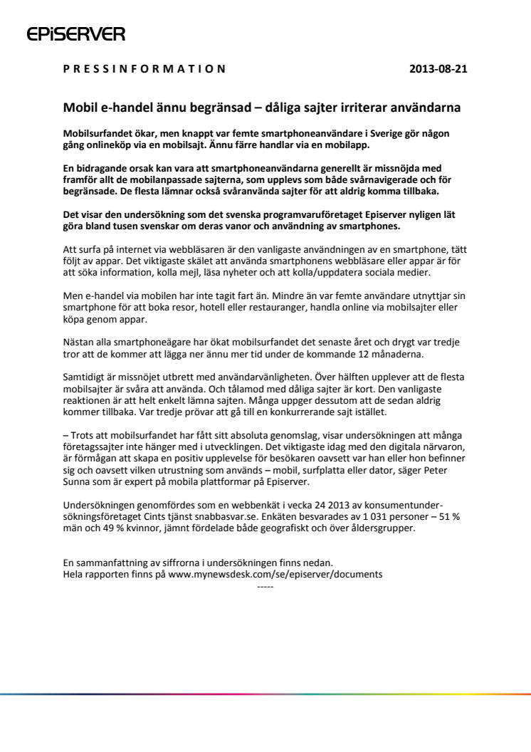 Mobilsurfandet ökar, men knappt var femte smartphoneanvändare i Sverige gör någon gång onlineköp via en mobilsajt. Ännu färre handlar via en mobilapp. Det visar den undersökning som det svenska programvaruföretaget Episerver nyligen lät göra bland tusen svenskar om deras vanor och användning av smartphones.
