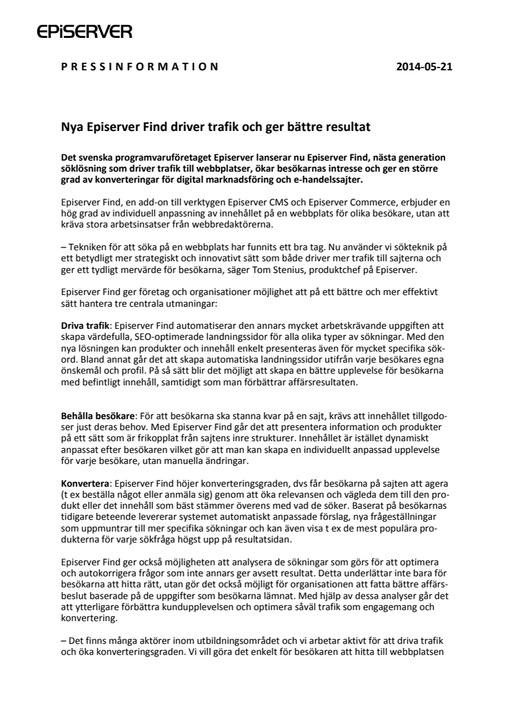 Det svenska programvaruföretaget Episerver lanserar nu Episerver Find, nästa generation söklösning som driver trafik till webbplatser, ökar besökarnas intresse och ger en större grad av konverteringar för digital marknadsföring och e-handelssajter.
