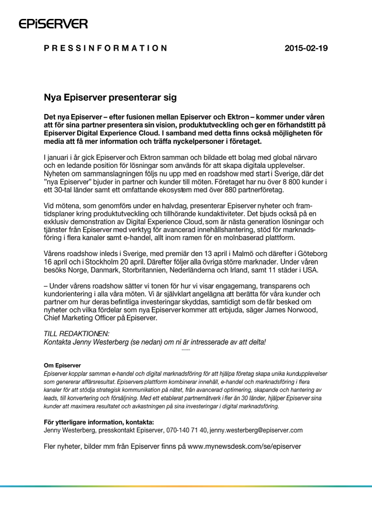 Det nya Episerver – efter fusionen mellan Episerver och Ektron – kommer under våren att för sina partner presentera sin vision, produktutveckling och ger en förhandstitt på Episerver Digital Experience Cloud. I samband med detta finns också möjligheten för media att få mer information och träffa nyckelpersoner i företaget.