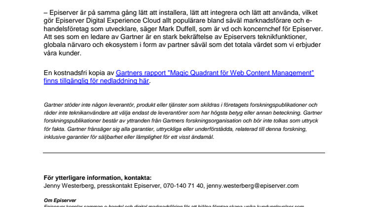– Episerver är på samma gång lätt att installera, lätt att integrera och lätt att använda, vilket gör Episerver Digital Experience Cloud allt populärare bland såväl marknadsförare och e-handelsföretag som utvecklare, säger Mark Duffell, som är vd och koncernchef för Episerver. Att ses som en ledare av Gartner är en stark bekräftelse av Episervers teknikfunktioner, globala närvaro och ekosystem i form av partner såväl som det totala värdet som vi erbjuder våra kunder.