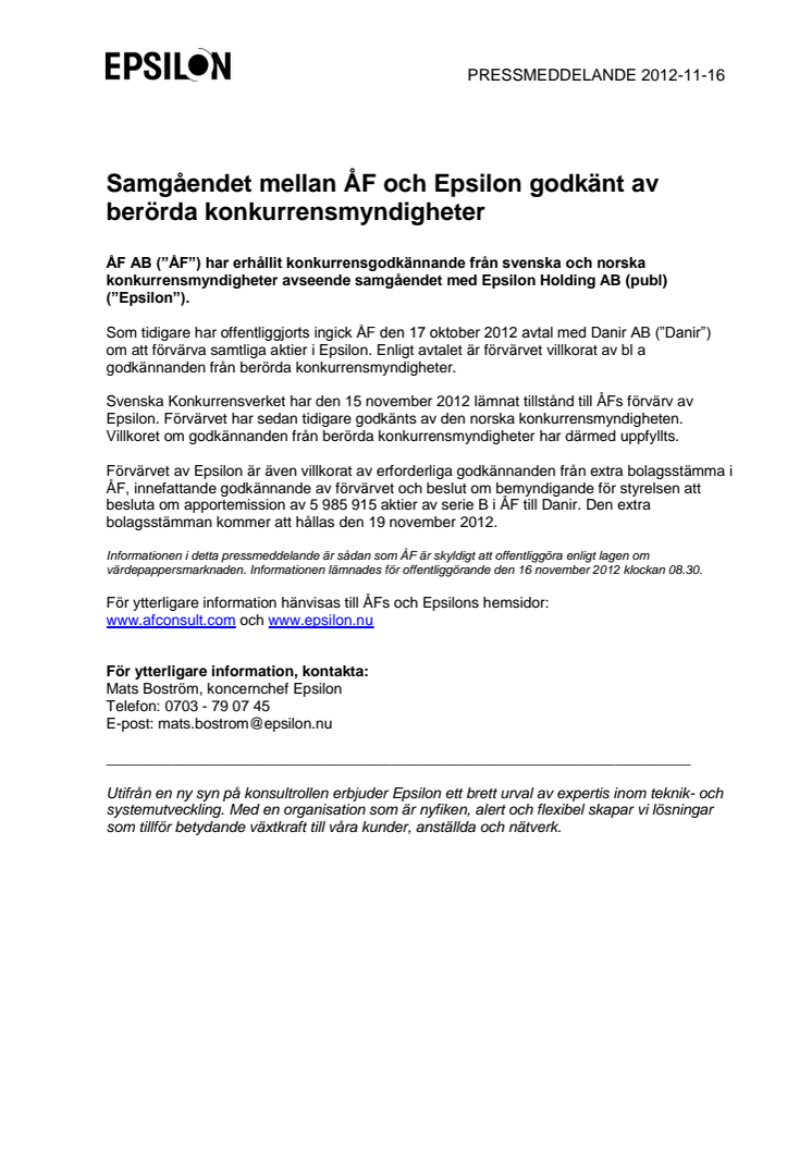 ÅF AB (”ÅF”) har erhållit konkurrensgodkännande från svenska och norska konkurrensmyndigheter avseende samgåendet med Epsilon Holding AB (publ) (”Epsilon”).