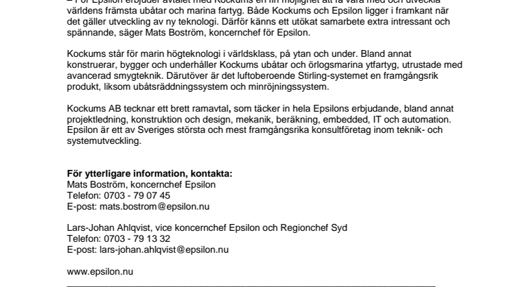 – För Epsilon erbjuder avtalet med Kockums en fin möjlighet att få vara med och utveckla världens främsta ubåtar och marina fartyg. Både Kockums och Epsilon ligger i framkant när det gäller utveckling av ny teknologi. Därför känns ett utökat samarbete extra intressant och spännande, säger Mats Boström, koncernchef för Epsilon.
