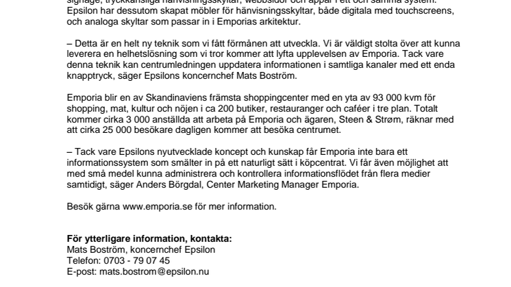 – Detta är en helt ny teknik som vi fått förmånen att utveckla. Vi är väldigt stolta över att kunna leverera en helhetslösning som vi tror kommer att lyfta upplevelsen av Emporia. Tack vare denna teknik kan centrumledningen uppdatera informationen i samtliga kanaler med ett enda knapptryck, säger Epsilons koncernchef Mats Boström.