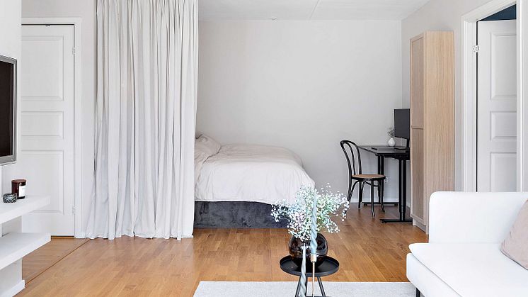 För ett par år sedan var det många som satte in industriglas för att dela av bostaden och skapa en känsla av ett extrarum. Idag är det populärt att använda textilier som avdelare för till exempel en sovalkov eller garderobsförvaring. På så sätt kan du välja att ha den öppna känslan, eller dölja förvaringen eller sovplatsen när du önskar det. Att hänga gardinen från taket istället för på väggen ger också en härlig känsla av rymd.