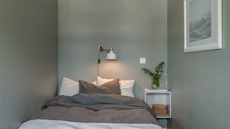 Men det kommer även till inredningen. Så klart i detaljer till en början. Kanske en kul kruka, en pläd eller en ljusstake? Men det kommer mer. Det har börjat bli trendigt att måla delar av rummet i en annan färg, som t.ex. större lister, eller varför inte taket. Det skulle kunna vara i den här olivgröna tonen.