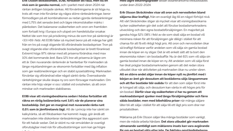 Erik Olsson Bostadsindex, EOBi, fortsätter att falla, men till en nivå som är ganska normal, och i paritet med våren 2024 när räntan äntligen började sänkas. Att förväntningarna är så höga nu, trots att man inte förväntar sig några större räntesänkningar, beror förmodligen på att kombinationen av redan gjorda räntesänkningar med 1,75% det senaste året och lägre inkomstskatter märks i plånboken. Det balanserar osäkerheten och oron om framtiden som fortsatt krig i Europa och utspel om handelstullar orsakar. Nettot (de som tror på prisökning minus de som tror på sänkning) är +33 (+69 i feb). Att EOBi faller så mycket beror på att många har gått från en tro på svagt stigande till oförändrade bostadspriser. Tron på svagt stigande eller oförändrade bostadspriser är brett förankrad. Extremt höga 97% räknar med att priserna förändras med max 10% det kommande året. Bara 12% tror att priserna är lägre om ett år. Den nuvarande räntenivån är hanterbar för marknaden så länge mjuklandningen av ekonomin fortsätter med låg inflation som ger reallöneökningar och en stabil sysselsättning. Marknaden förväntar sig oförändrad eller något sänkt ränta. Överraskande räntehöjningar skulle skapa ny oro som försvagar marknaden. Om räntan inte höjs vänjer vi oss i stället vid ovissheten, så att oron minskar och marknaden stabiliseras.