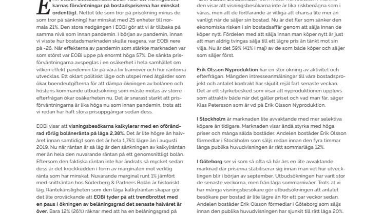 De sänkta prisförväntningarna avspeglas i en osäkerhet i hela samhället om vilken effekt pandemin får på våra liv framöver och hur räntorna utvecklas. Ett oklart politiskt läge och utspel med åtgärder som ökar boendeutgifterna för att dämpa ökningen av bolånen och höstens kommande utbudsökning som måste mötas av större efterfrågan ökar osäkerheten nu. Det är snarast starkt att prisförväntningarna är lika höga nu som innan pandemin, trots att vi redan har haft stora prisuppgångar sedan dess.
