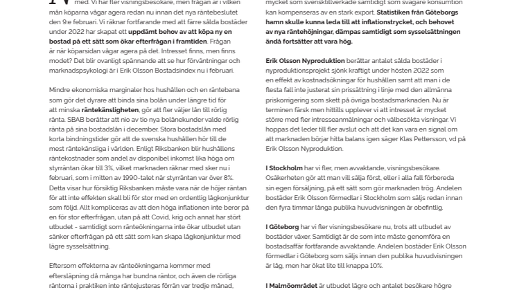 Erik Olsson Nyproduktion berättar antalet sålda bostäder i nyproduktionsprojekt sjönk kraftigt under hösten 2022 som en effekt av kostnadsökningar för hushållen samt att man i de flesta fall inte justerat sin prissättning i linje med den allmänna priskorrigering som skett på övriga bostadsmarknaden. Nu är terminen färsk men hittills upplever vi att intresset är mycket större med fler intresseanmälningar och välbesökta visningar. Vi hoppas det leder till fler avslut och att det kan vara en signal om att marknaden börjar hitta balans igen säger Klas Pettersson, vd på Erik Olsson Nyproduktion.