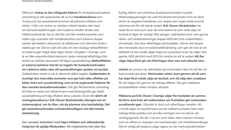 Eftersom räntan är den viktigaste faktorn för bostadsmarknadens utveckling är det spännande att se hur handelstullarnasom Trump just har presenterat kommer att påverka inflation och räntor i USA och resten av världen. Initialt talades det mest om att kostnadsökningen som tullarna medför skulle vara inflationsdrivande. Nu är det fler och fler insatta experter som målar upp scenarier där handelshindren som tullarna skapar sänker aktiviteten i ekonomin så inflationen och därmed räntan i stället går ner. Det är svårt att veta om den slutliga nettoeffekten av tullarna ger högre eller lägre räntor i längden. I Sverige, som är en liten exportinriktad ekonomi, leder minskad efterfråga från resten av världen dessutom till lägre sysselsättning. Nettoeffekten av tullarna behöver inte bli så negativ för bostadsmarknaden om räntorna sänks utan att sysselsättningen sjunker så mycket. Osäkerheten innan vi vet är däremot alltid negativ. Osäkerheten är ovanligt stor med olika scenarier som ger helt olika effekter på både ränta och sysselsättning, som är två avgörande faktorer för den svenska bostadsmarknaden. Det gör Riksbankens utmaning att hitta en ränta som tillsammans med finanspolitik ger stabil sysselsättning och låg inflation ännu svårare. Då är det skönt att visningsbesökarna i Erik Olsson Bostadsindex återigen har en räntemarginal, om än liten, när de planerar sina bostadsköp. Det gör bostadsmarknaden motståndskraftigare och lite mindre räntekänslig.