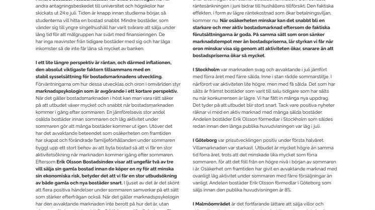 Mindre bostäder i studentstäder får ökad efterfrågan nu när andra antagningsbeskedet till universitet och högskolor har skickats ut 24:e juli. Tiden är knapp innan studierna börjar, så studenterna vill hitta en bostad snabbt. Mindre bostäder, som vänder sig till yngre singelhushåll har varit svårare att sälja under lång tid för att målgruppen har svårt med finansieringen. De har inga reavinster från tidigare bostäder med sig och har låga inkomster så de inte får låna så mycket av banken.